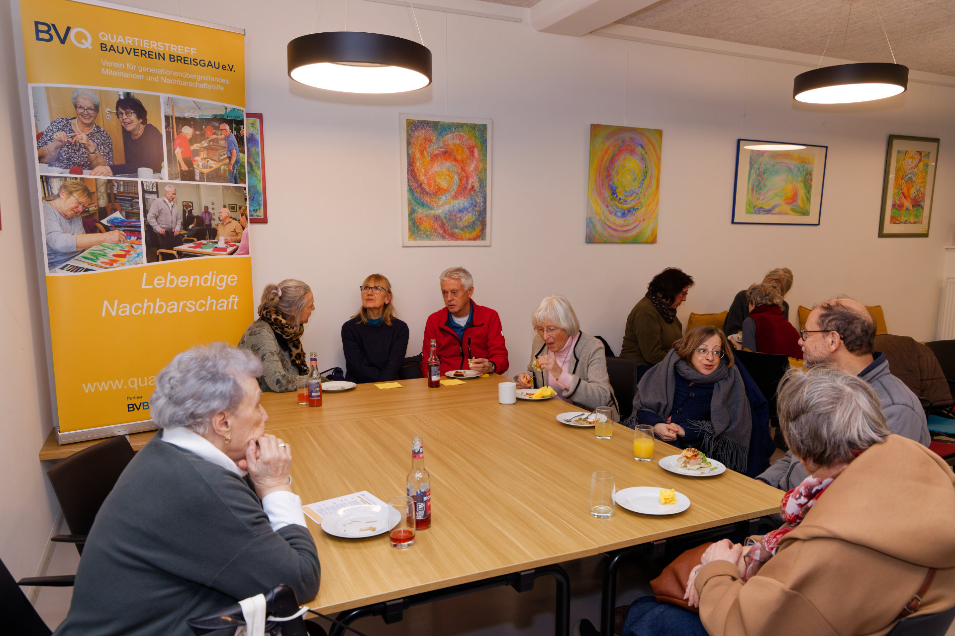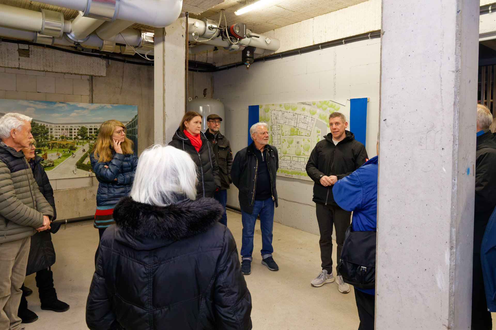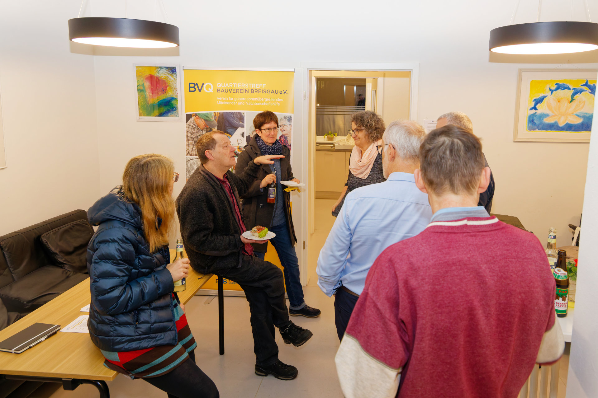 Am 23. Januar hatten Baugenossenschaft und Quartiersverein zum "Quartiersrundgang" ins Uni-Carré eingeladen. Quartiersvertreterin Doris Banzhaf und Mitarbeiterin Elisa Dold stellten die Arbeit des Quartierstreffs vor, Genossenschaftsvorstand Marc Ullrich sprach über den Mehrwert genossenschaftlichen Wohnens und führte kenntnisreich durch die Wohnanlage. Im Anschluss wurde der Austausch fortgeführt: bei Essen (besten Dank an die Bäckerei Reiß Beck für die freundliche Unterstützung) und Getränken fand die Veranstaltung einen geselligen Ausklang (Fotos: Stephan Seyl).